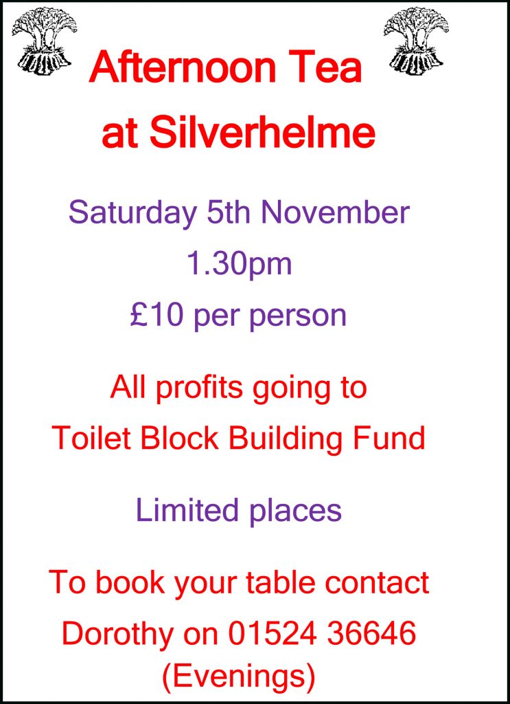 * Please note that this event has been postponed due to lack of response. Saturday 5th November 2016 1.30pm £10 per person All profits going to Toilet Block Building Fund. Limited places. To book your table contact Dorothy on 01524 36646 (Evenings) afternoon-tea