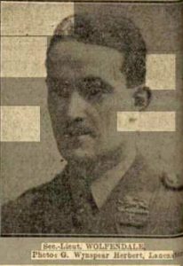 The first Military Cross conferred upon a local Territorial is bestowed upon Second-Lieut. William Atkinson Wolfendale, who was mentioned in Sir John French’s despatch on New Year’s Day. This gallant young officer was only 19 at the time he earned his distinction, having just attained his 20th birthday. He is the son of Mr. and Mrs. Caleb Wolfendale, of Howe Ghyll, Lancaster. Educated at the Friends’ School, Lancaster, and trained as a dentist, he obtained a commission in the 5th King’s Own Royal Lancaster Regiment on the outbreak of the war, being gazetted second-lieutenant September 5, 1914, and he relinquished his professional examination. Being too young for Imperial service when the 1st/5th joined the Expeditionary Force, he assisted in raising the 2nd/5th, and at Altcar qualified as a first-class machine gun instructor. Rejoining his regiment at Sevenoaks, he was one of seven officers who went out in March last, taking the place of another officer at a day’s notice – five of the seven being quickly returned in the casualties.